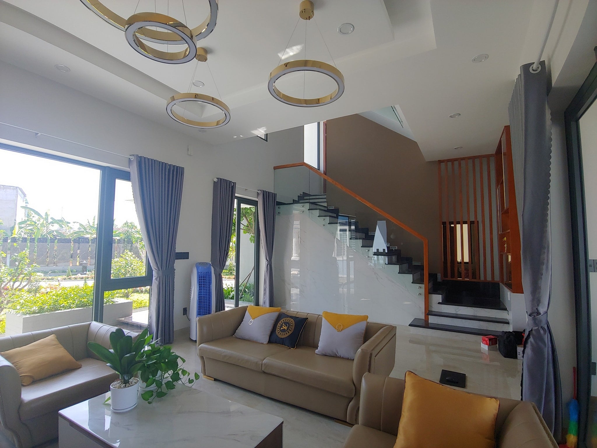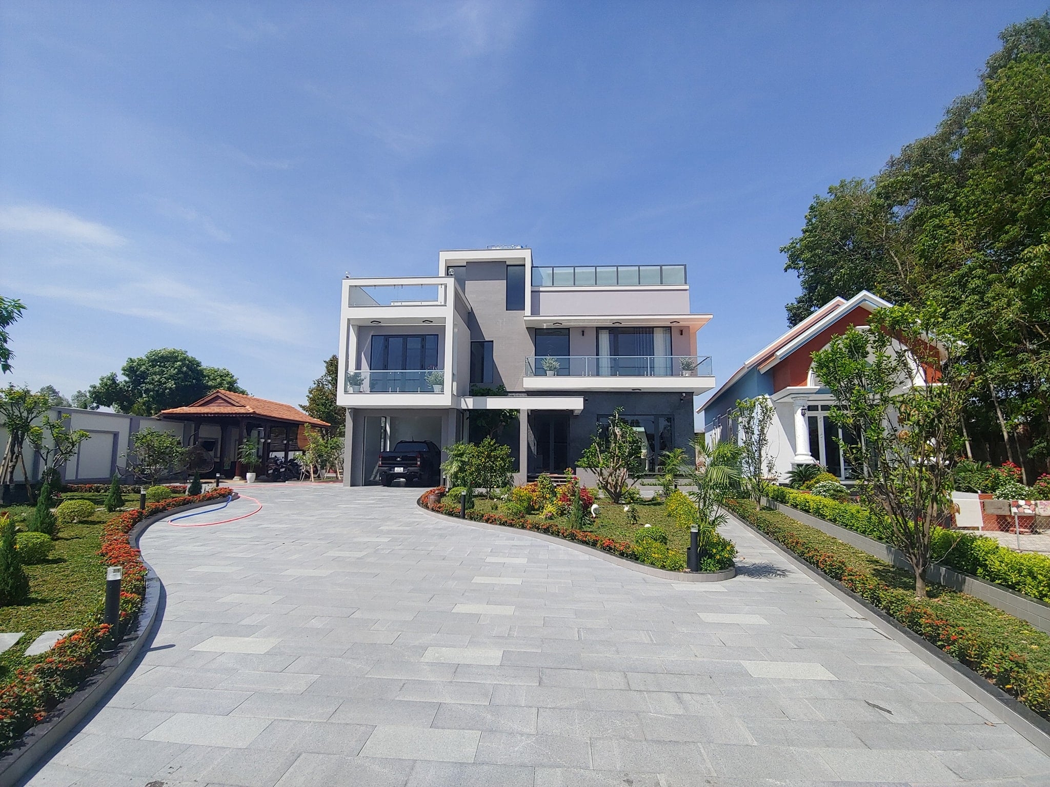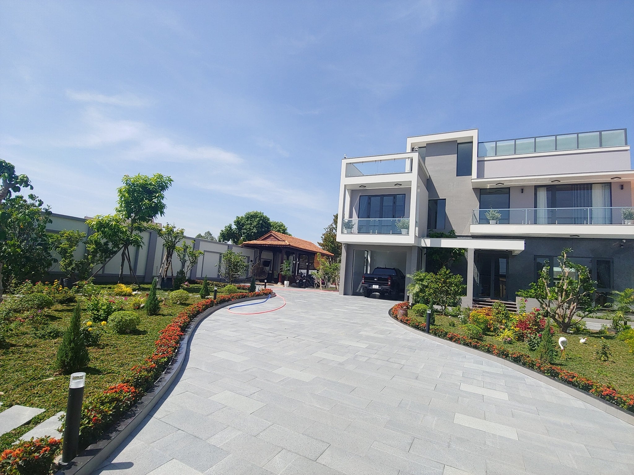 Công trình là 1 căn biệt thự hiện đại, sang trọng, sở hữu khuôn viên rộng rãi, ngập tràn cây cối.
